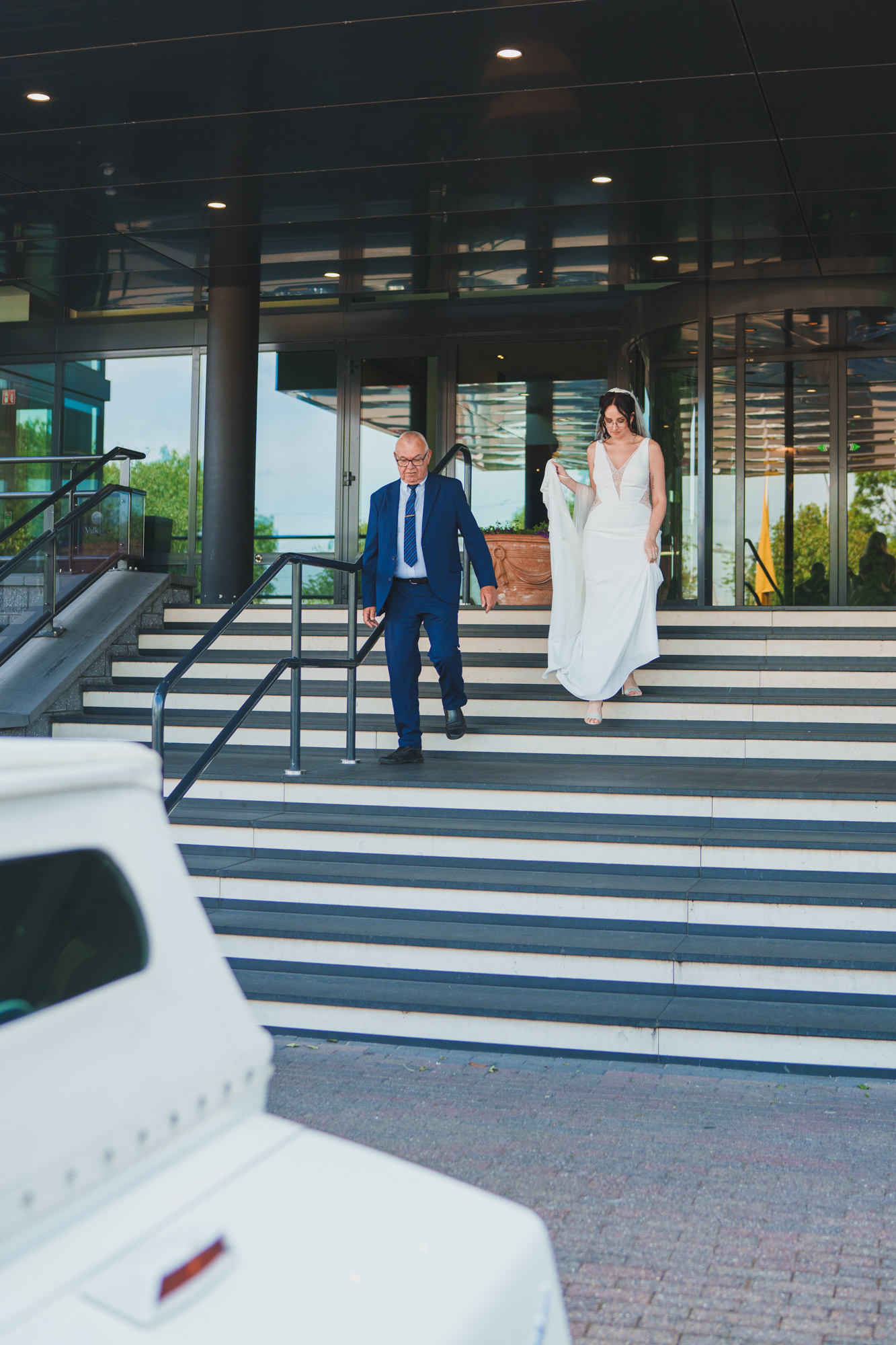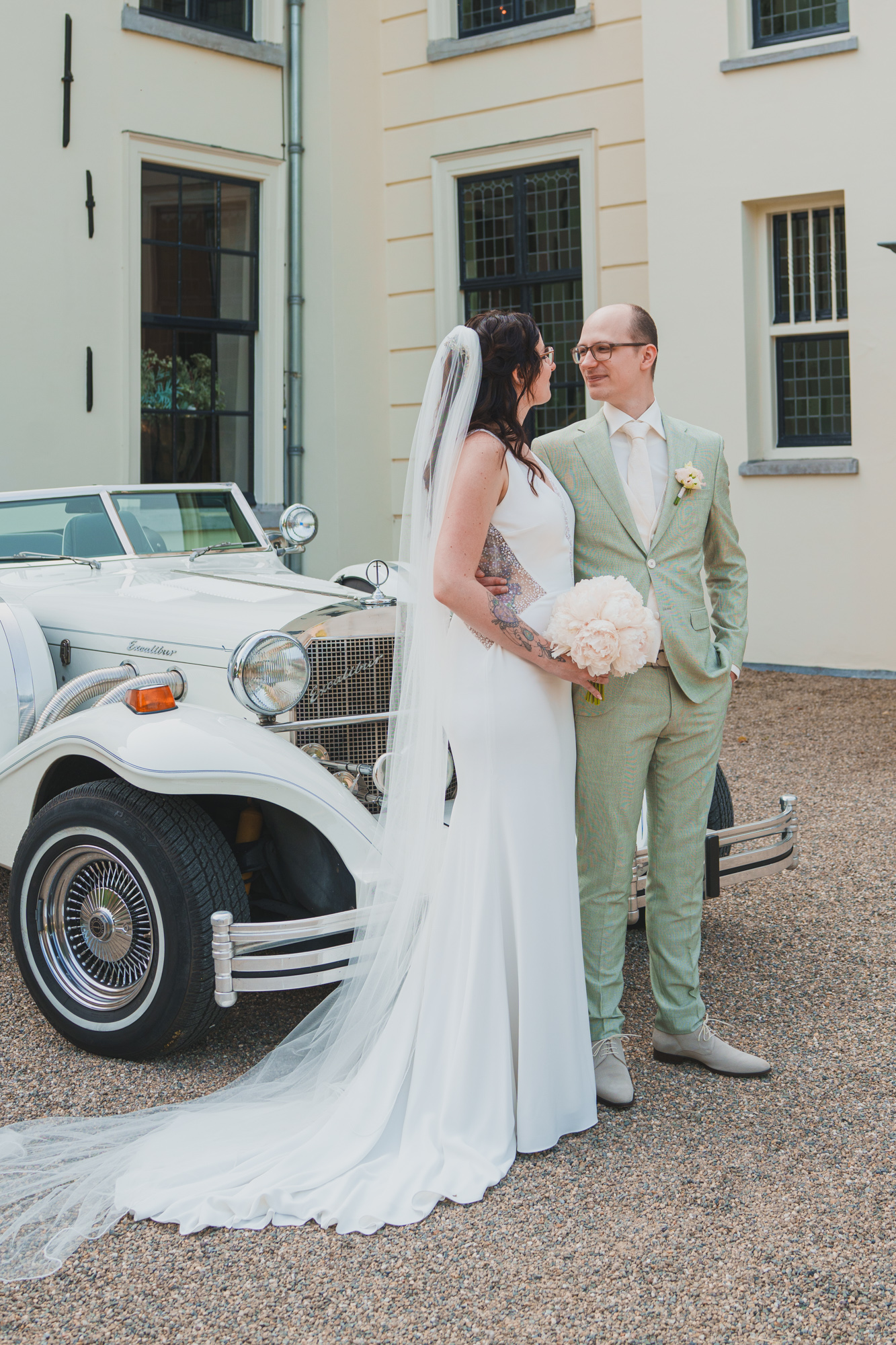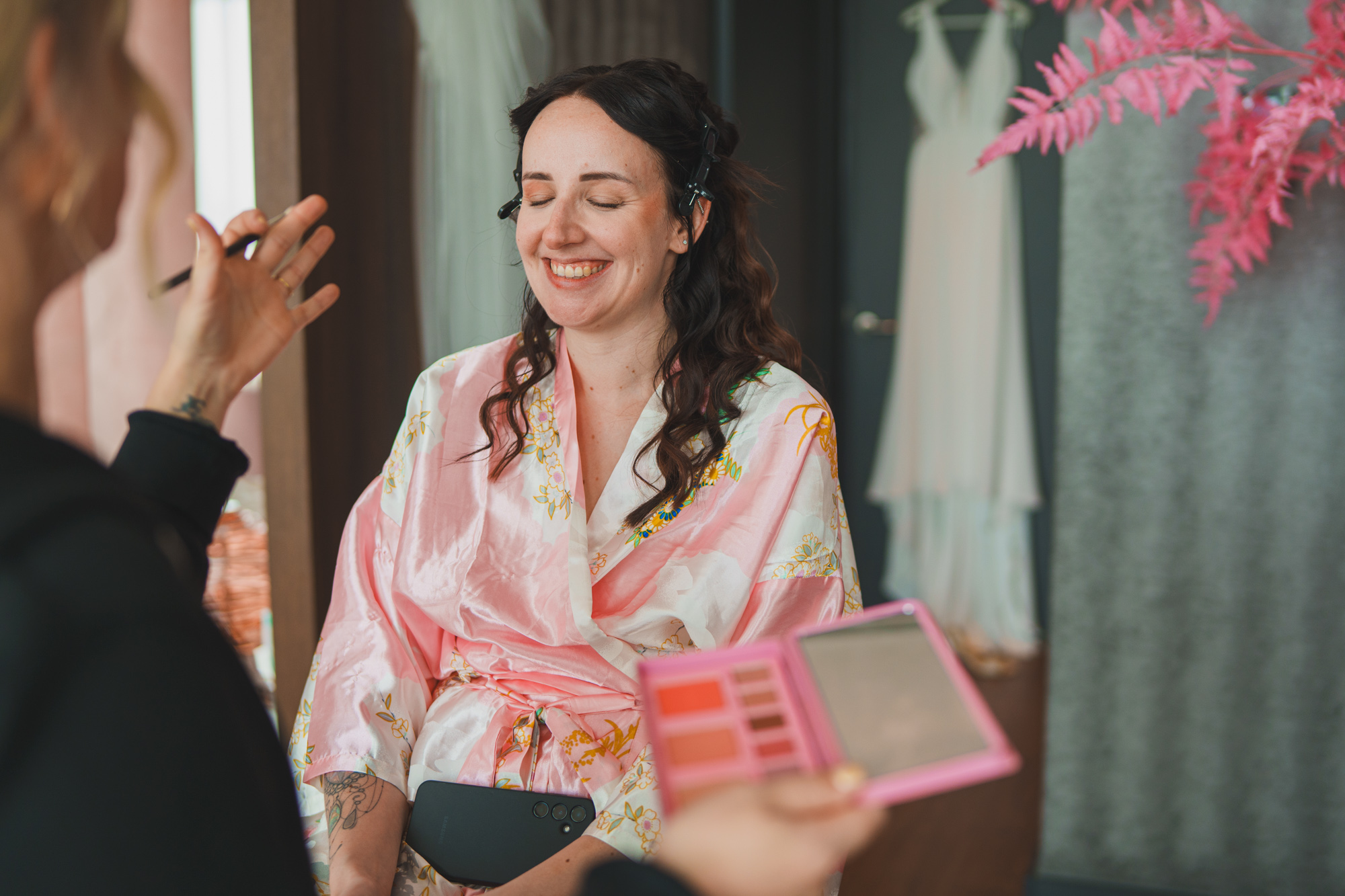 Het bruidspaar maakte zich klaar bij Van der Valk Nootdorp, allebei in een aparte kamer. Ik begon bij Davey, die werd geholpen door zijn vader. Toen ging ik door naar boven, waar Sharon zich klaarmaakte in een grote suite. Dit was heerlijk! Lekker veel ruimte en mooi licht. De makeup en haarstyling deed een vriendin, waardoor de sfeer lekker relaxt was. Toen ze klaar was, stond de fantastische trouwauto van 123 Trouwauto al klaar. Zo gaaf!